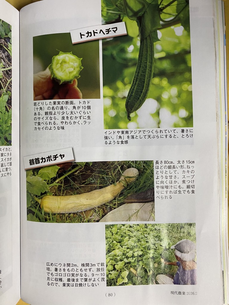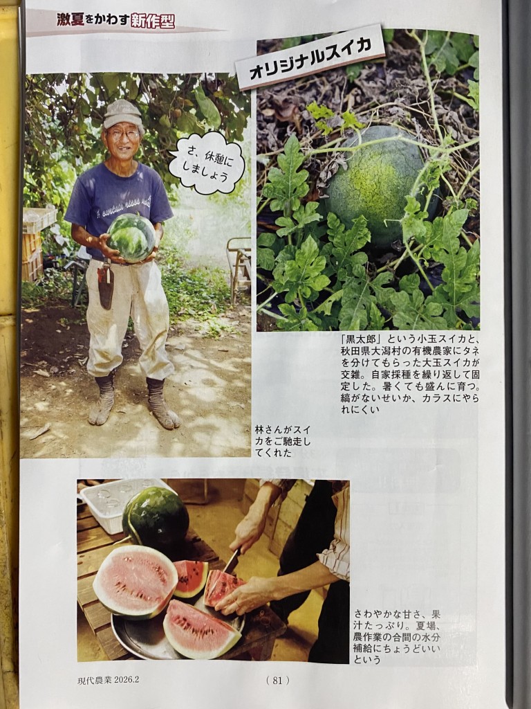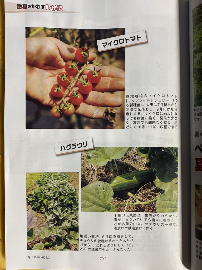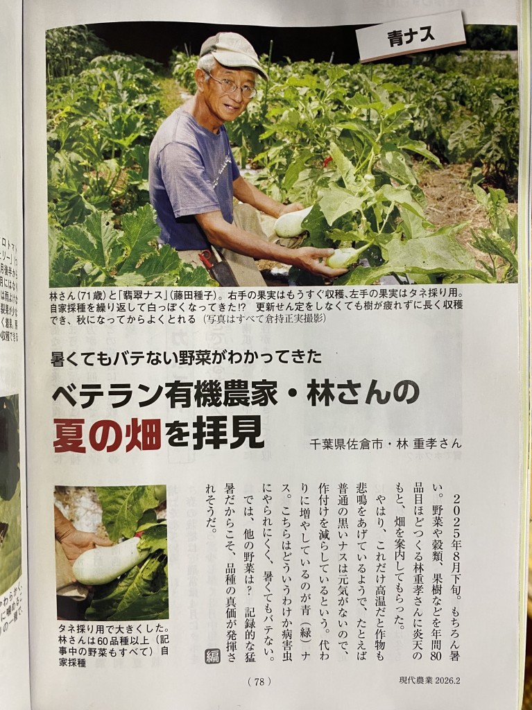 農文協発行の月刊誌『現代農業」2月号に林農園が紹介されました。猛暑にも成育が良く、耐暑性の作物が写真で掲載されました。